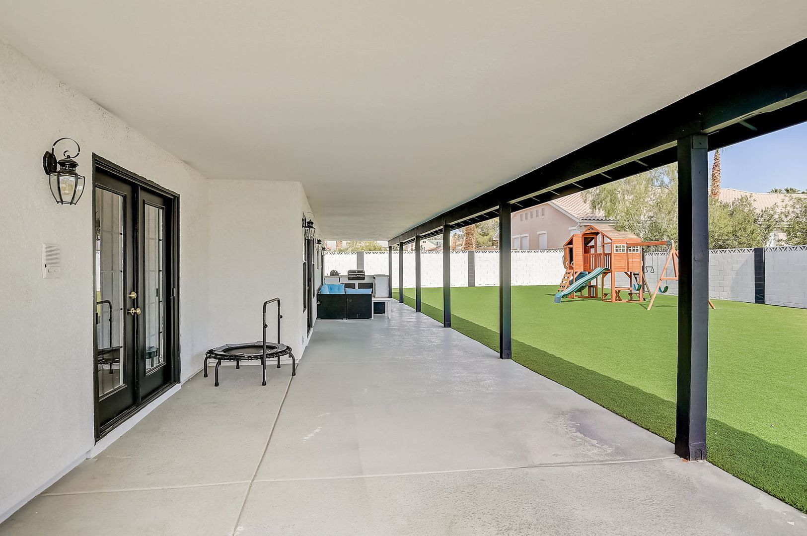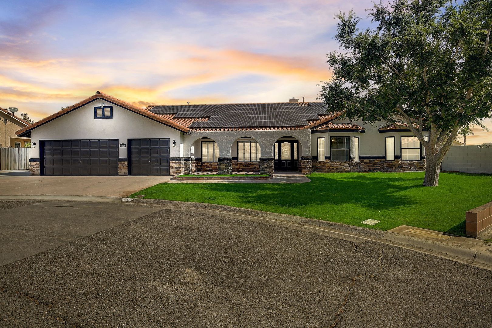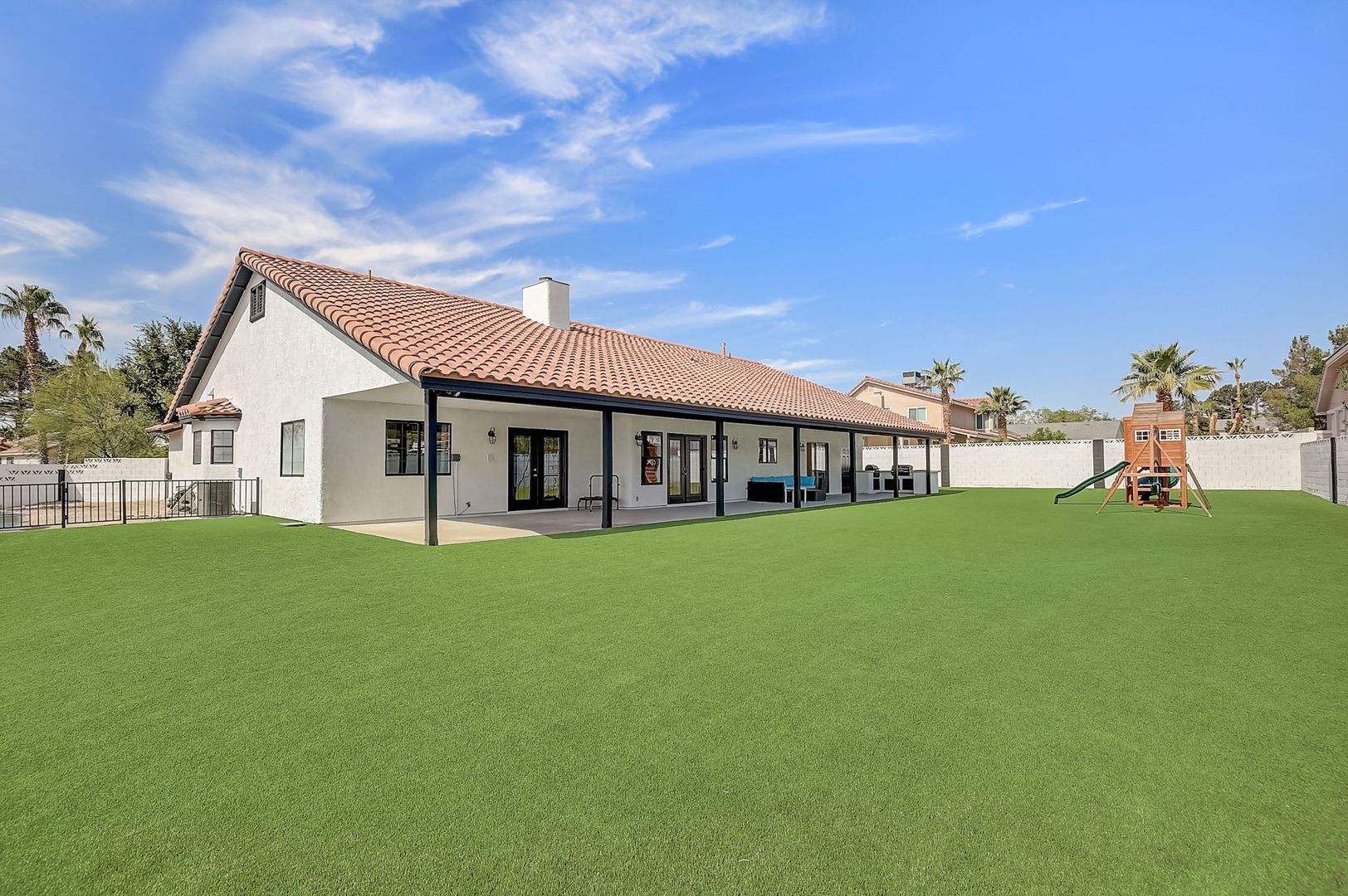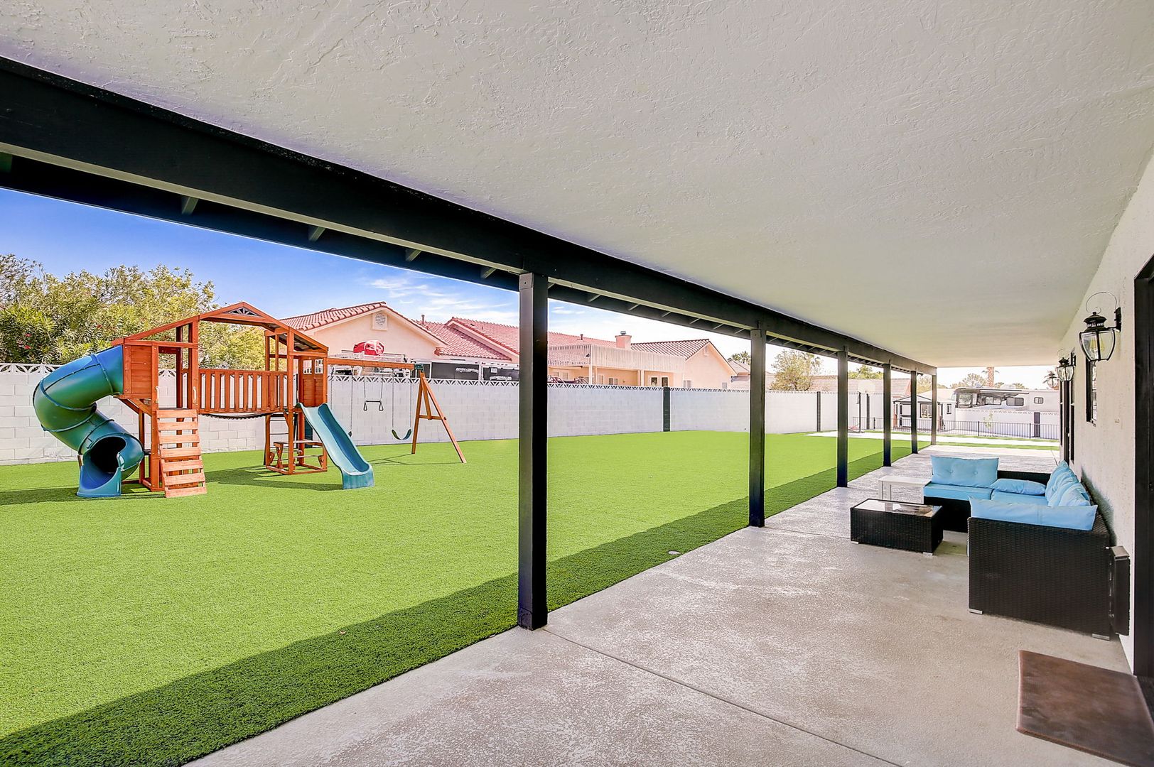 Welcome to your dream rental home, where luxury meets sustainability! This remarkable residence offers an unparalleled living experience with an incredible perk—virtually no power bills AND DOUBLE RV + boat parking! Seriously- park your 40' RV on one side. Then park your boat and trailer on the other side! Equipped with 70 solar panels, this home powers 2 AC units, can charge 2+ electric vehicles, and still generate surplus energy. Enjoy the freedom of NO HOA, on a 1/2 acre lot with RV parking to accommodate up to 4 toys and a 3-car garage. With over 3300 sq ft, 4 beds, 3 baths, den, wet bar, and full-size tool room, there's ample space for all your needs! The gourmet kitchen boasts double ovens, a 5 burner gas cooktop, and 2 refrigerators. Upgrades abound! Enjoy a low maintenance front & back yard and complete with spacious artificial turf, sports court, garden space & shed. Relax under the covered patio while watching children play on the playground. Located in quiet Section 10, don't miss out on this exceptional rental to live in luxury with minimal bills!